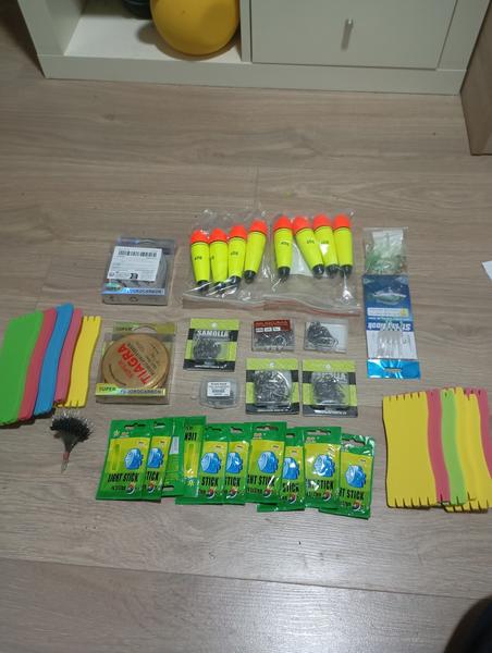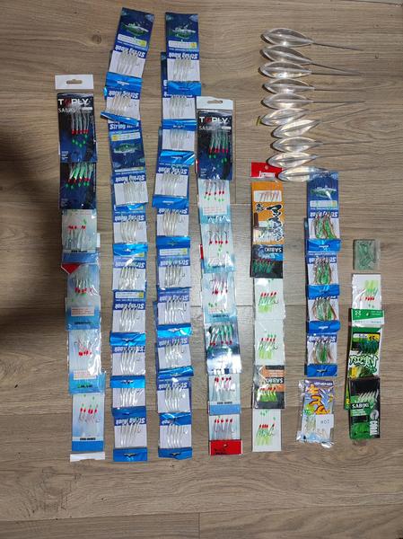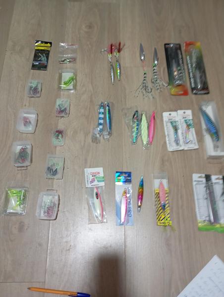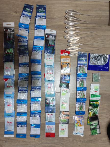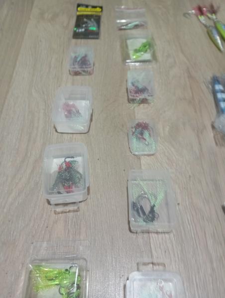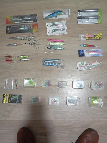Gran lote compuesto por numerosos señuelos de pesca de goma, plumas y muestras de jigging entre 100 y 120 gramos. Flotadores, cajas de anzuelos de varios tamaños, sticks de luz fluorescente, anzuelos para jigging.