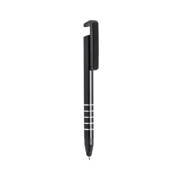 Bolígrafo con puntero, limpia pantalla, soporte para móvil. Elegante bolígrafo con puntero, soporte y limpiapantallas para móvil. El bolígrafo multifunción, además de permitirnos la escritura, podrás usarlo para apoyar tu móvil en su soporte, usar su puntero en tu móvil y también limpiar la pantalla de tu teléfono con su limpiapantallas incorporado.
