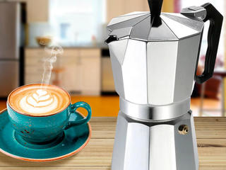 Cafetera italiana fabricada en aluminio de color plateado, para hacer el café con el mejor ...