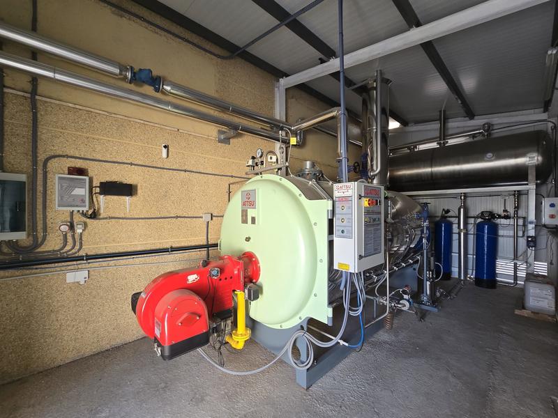 Caldera a vapor de tres pasos de humos con hogar invertido marca ATTSU modelo RL2000 producción de vapor 2.000 Kgv/h, presión de diseño 8 bar, equipada con un grupo de bombeo grundfos, con purga de lodos automática, equipada con quemador Monarch Weishaupt W MG20/3-A/AMLN combustión gas PROPANO, rampa de gas 50 mbar 1-1/2” regulación modulante, con instalación. Descalcificador Volumétrico Marca CLACK WS1TT DF 1” dos botellas de 80 litros de resina, conexión 1”, indica el volumen de agua blanda restante hasta la siguiente regeneración y el caudal instantáneo. Programador digital Presión disponible en la red de 2,5 a 5 bar.