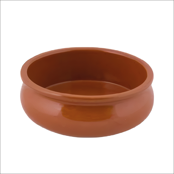 Cazuela de barro abombada de 18 cm, elaborada con un material duradero, diseñada para proporcionar una cocción homogénea y una óptima retención del calor en el sector horeca.