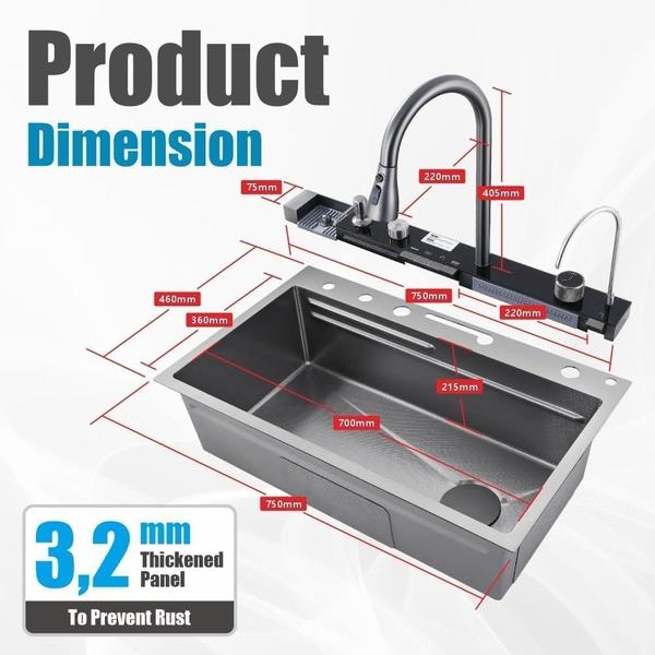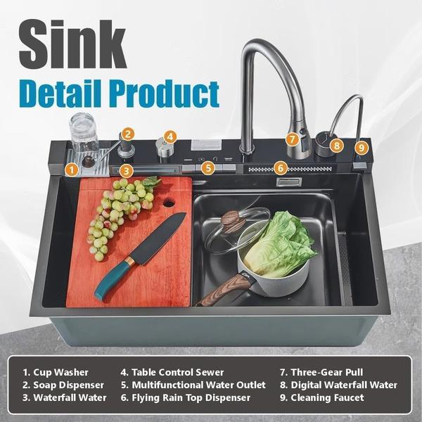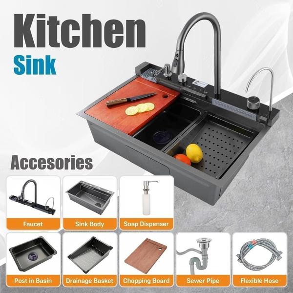 Fregadero de Cocina de Acero Inoxidable con Cascada y Lavavasos, Multifuncional inteligente con Grifo Extraíble, Dispensador de Jabón y Accesorios.