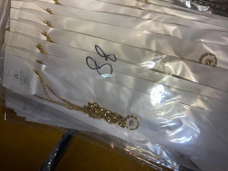Collares y Colgantes (Aprox. 800+ unidades): Una amplia selección de diseños que incluyen desde cadenas minimalistas hasta colgantes con motivos geométricos y de tendencia. Acabados elegantes en color oro de 18k.