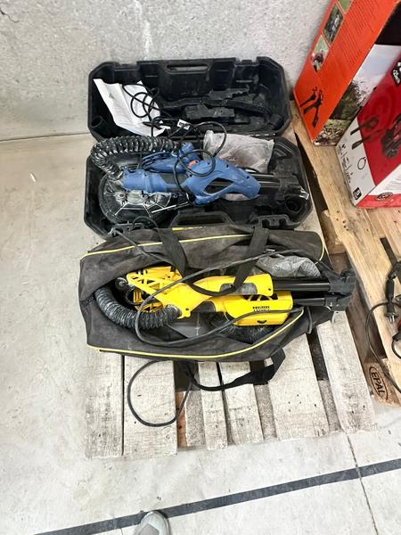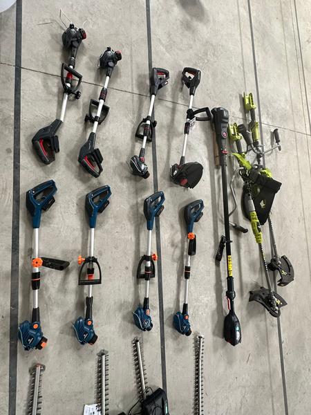 Se vende lote amplio de herramientas eléctricas, maquinaria de jardín y equipos varios. Incluye motosierras, cortasetos, sopladores, taladros, radiales, desbrozadoras, cortacéspedes, hidrolimpiadoras, calefactores y más material de marcas como Black+Decker, Sterwins, Worx, Parkside, Garland, DeLonghi, Zibro, entre otras.