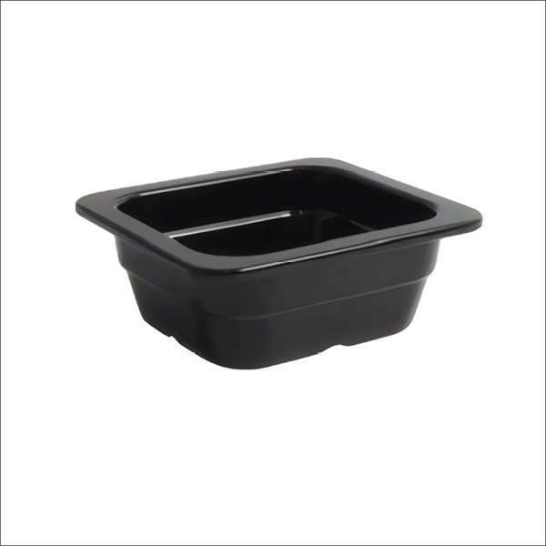 Fuente gastronorm negra HN 1/6 de 26,5×16,2×6,5 cm, elaborada con material duradero, adecuada para el almacenamiento y exhibición de alimentos en el sector horeca.