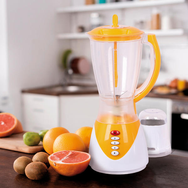 Batidora con cuchillas de acero inoxidable y una práctica jarra de plástico de alta resistencia, ideal para mezclar todas tus salsas y preparados.