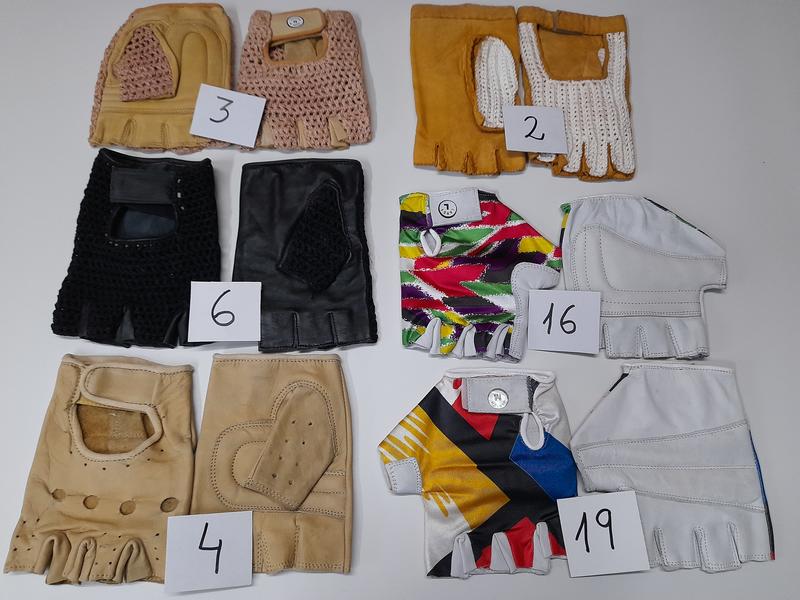 Por jubilacion en el negocio, se vende lote de 55 pares de guantes de conducir o de gimnasio, de piel y de piel con licra; en la foto, sobre cada guante , se muestra la cantidad que hay de cada modelo o color.