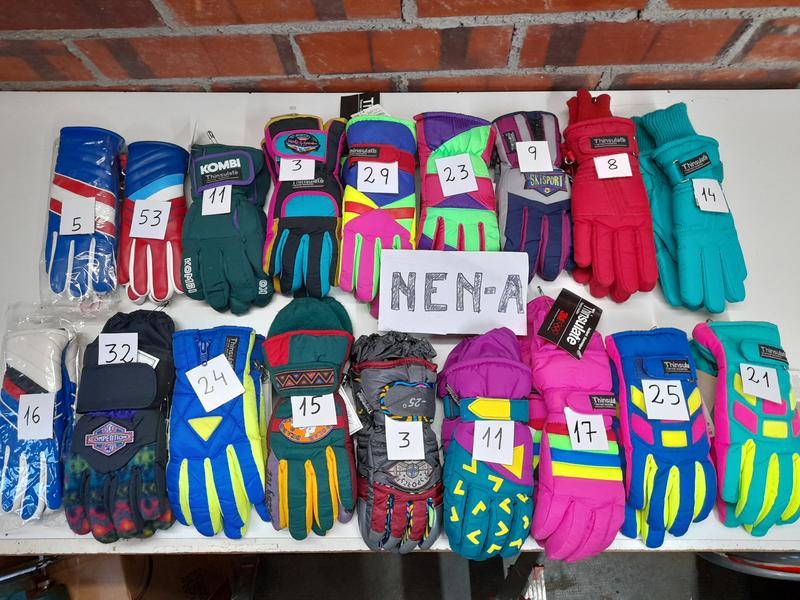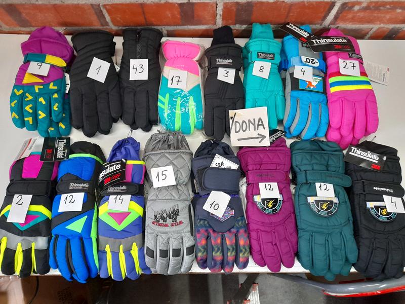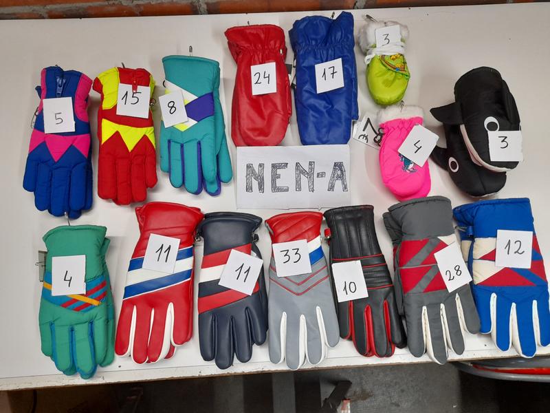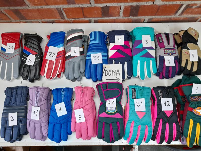 Por jubilacion en el negocio, se vende lote de guantes de sky vintage, compuesto de 338 guantes de tallas de hombre, 380 de tallas de mujer y 507 de tallas infantiles; en las fotos sobre cada guante se muestra la cantidad que hay de cada modelo. El lote sale por 1100 euros