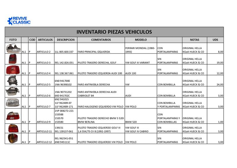 Nos dedicamos a la venta de Recambios de Coches. Actualmente, contamos con un lote superior a 250.000 piezas, todas nuevas y originales Hella Hueck KGaA & Co. Si te interesa el lote entero, o hacer tu propio lote con las existencias que tenemos, sólo tienes que decírnoslo. Estaremos encantados de atenderte. ReviveClassic