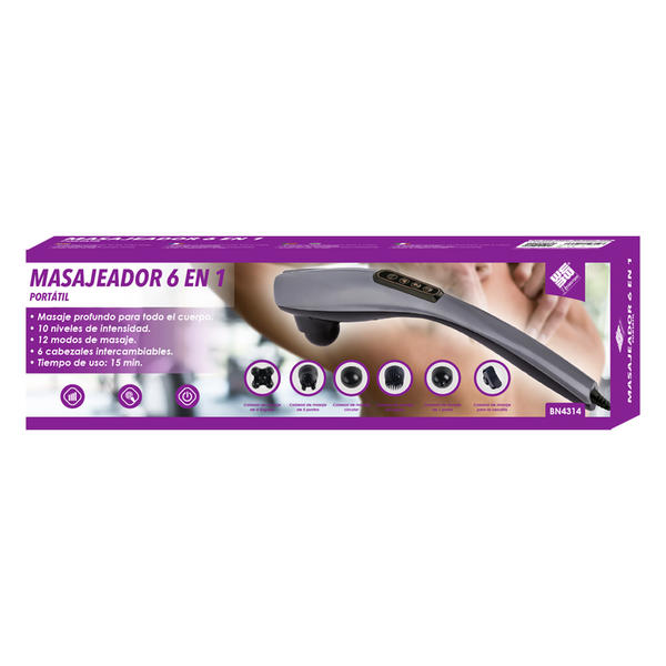 Este masajeador 6-en-1 eléctrico de cuerpo completo cuenta con un potente motor con 6 cabezales de masaje intercambiables, 10 marchas y 12 modos para una experiencia de masaje personalizada y efectiva.