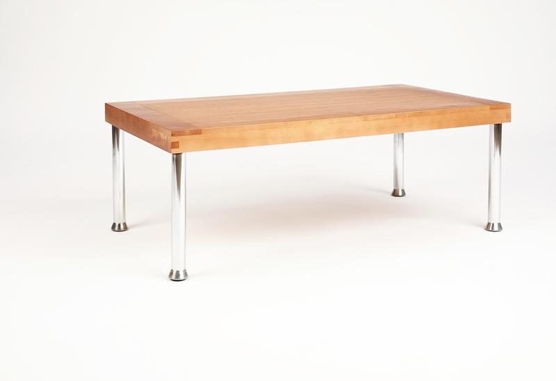 Mesa de centro con tablero de madera maciza y patas metálicas cromadas. Medidas: 110x60x40. Color: Natural.