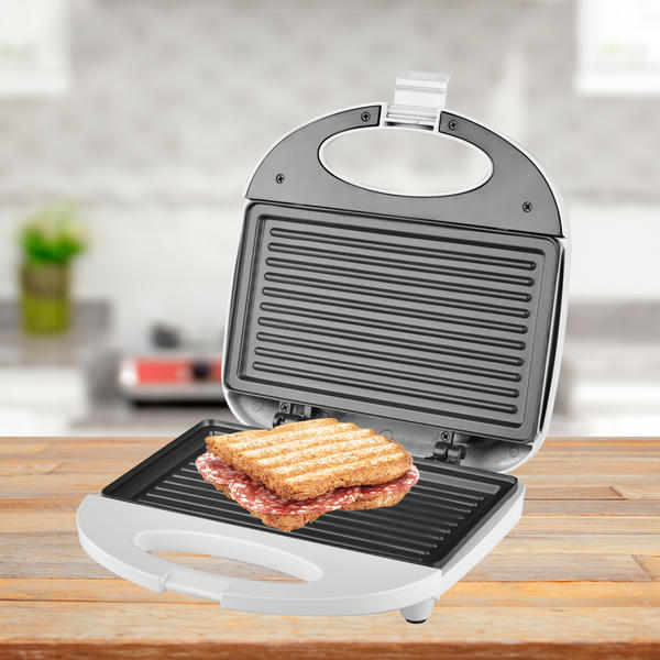 Su acabado en color blanco le confiere un aspecto limpio y sofisticado. Una de las características más destacadas de esta sandwichera es su placa con capa antiadherente, que facilita tanto la cocción sin necesidad de excesos de aceite como la limpieza posterior, asegurando que cada uso sea lo más sencillo posible.